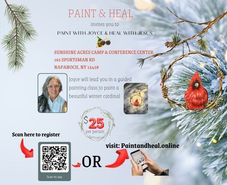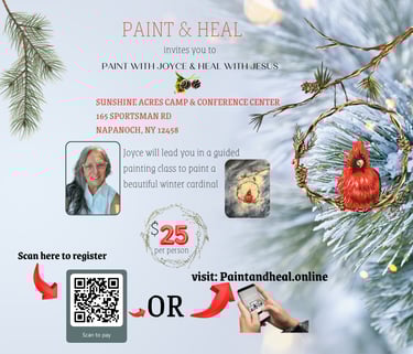 Let's paint a beautiful winter cardinal! This will be a guided painting class where you will have all the materials necessary to paint a beautiful painting! I will also be sharing my testimony of how Paint & Heal began!
